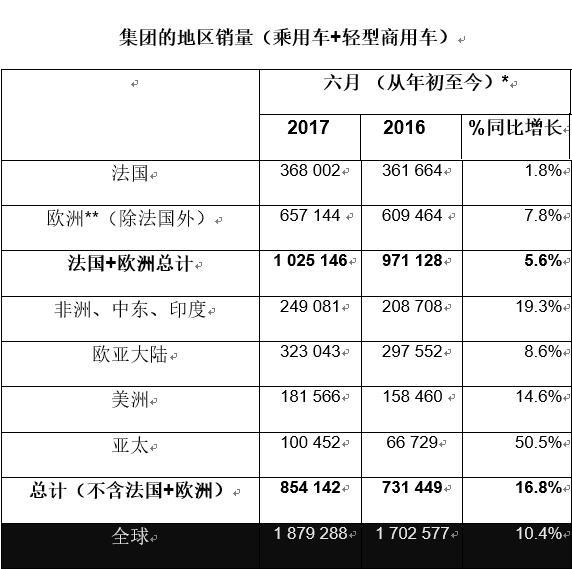 在欧洲,集团的上牌量增长速度持续超过了市场。上牌量增加了5.6%,而整个市场上牌增加了4.4%,在2017年上半年总计达1025146辆。集团占据了欧洲市场10.8%的份额,上涨了0.1个点。