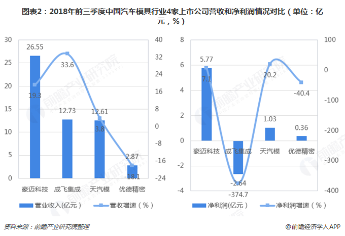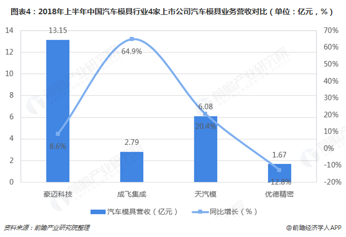 此外,仅从汽车模具这一业务来看,豪迈科技汽车模具在营收规模上仍具有显著优势,2018年上半年实现营收13.15亿元,遥遥领先于其他企业;而成飞集成虽然业务营收体量较小,但是同比增速高达64.9%,增长最快;优德精密的汽车模具业务营收却出现大幅下滑,同比减少了12.8%。