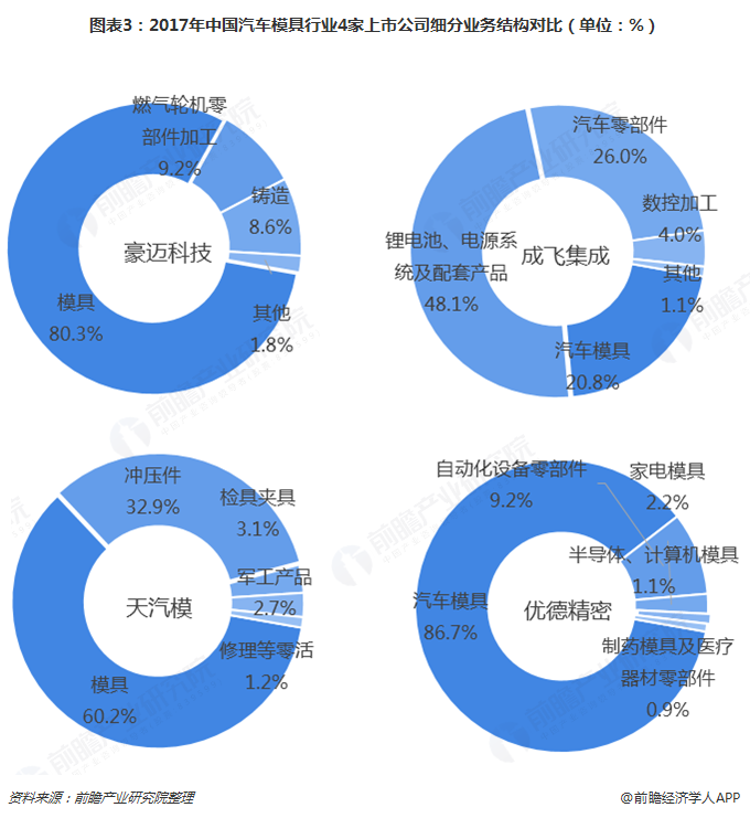 目前,国内从事汽车模具生产制造的上市公司主要有豪迈科技、成飞集成、天汽模和优德精密四家公司,各个公司在汽车模具领域有不同的业务重点:豪迈科技主产技术要求相对较低的汽车轮胎模具;而天汽模和成飞集成专注于汽车覆盖件模具;优德精密则从事技术难度更高的汽车零部件模具和精密模具。