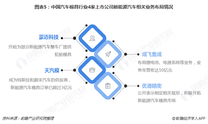 因此,不仅成飞集成通过开展锂电池业务进入了新能源汽车领域,其他三家公司也有在新能源汽车领域进行业务布局的举措或计划,通过与主流新能源汽车厂商合作等方式进军新能源汽车模具市场,将迎来更大的发展空间。