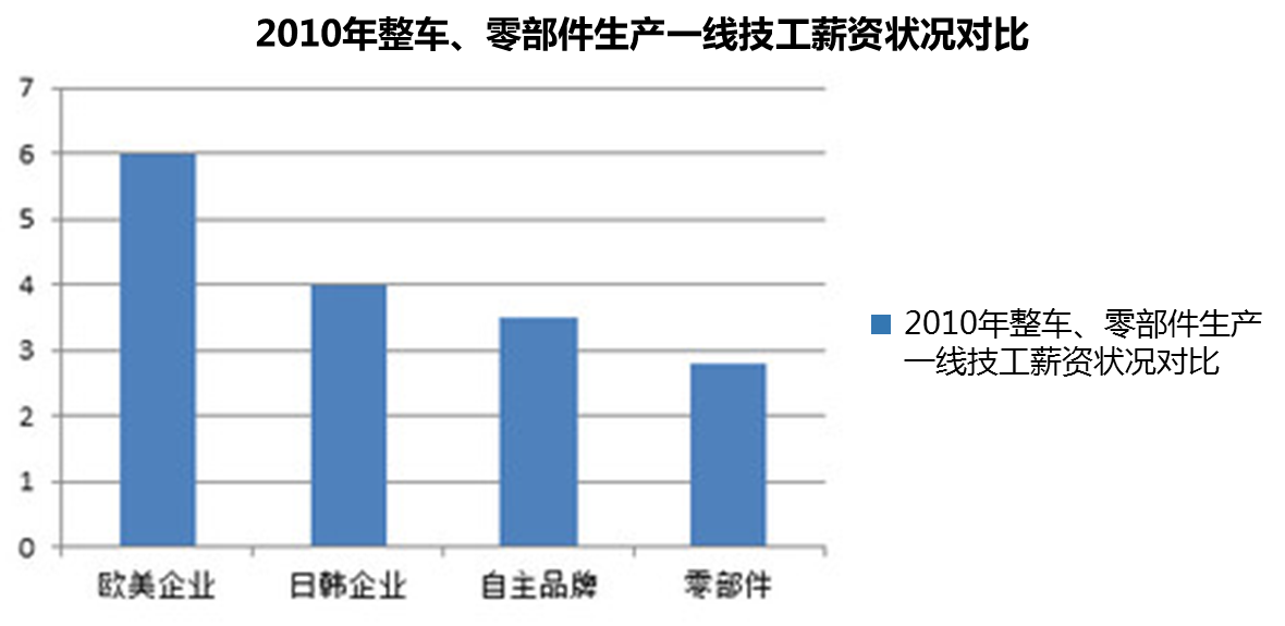 4、零部件一线员工薪资普遍低于整车企业。从企业类型来看,国内汽车行业中,合资企业的一线工人年薪基本高于自主品牌车企员工,差距大约在1万元。而在合资企业中,欧美车企普遍高于日韩企业。在调查中,一汽大众的工人待遇最高,编制内的总装线一线工人年薪可达7万元。而日韩合资企业一线工人年薪在3万~5万元。两种企业一线工人的薪酬差距将近一倍。与合资品牌不同,大部分自主品牌车企一线员工年薪集中在1.2万~3万元区间,仅比亚迪员工年薪处于高位,为2.4万~3.6万元。而相对于整车企业,利润更为丰厚的零部件企业一线员工的薪酬普遍偏低,尤以外资零部件企业更甚,一线工人年薪仅为1万~2万元左右。而某些大型国有零部件企业员工福利稍好,年薪可达3万元,中层管理人员年薪可达5万元左右。如下图所示: