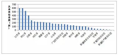 从从业单位数量看,江苏省、广东省、浙江省均超过500家。三省分别占从业单位总数的10.54%、10.47%和9.23%,形成第一集团,重庆市作为第二集团的排头以近7%的占比紧随其后,包括青海省、甘肃省在内的7个地区,其占比分别均不足1%。环境服务业从业单位地域分布如图12所示。