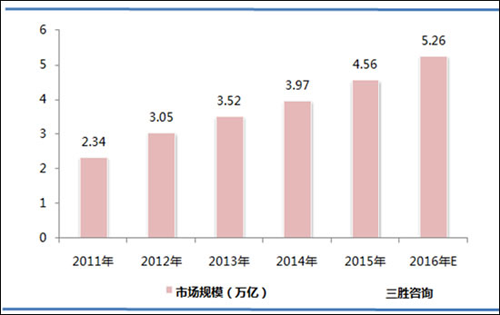 近年来,随着我国经济的稳健发展,我国环保行业的发展水平也得到了很大的提升。中国产业信息研究网发布的《2016-2020年中国环保行业深度调查分析及发展潜力预测报告》数据显示,2011年环保行业市场规模达为2.34万亿元,2015年环保行业市场规模达到4.56万亿元,平均增长率为15%左右。