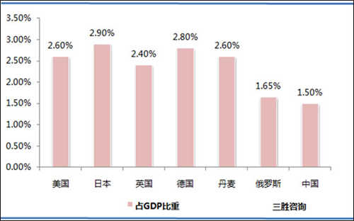 欧洲、美国、日本等国环保产业投资占GDP的比重一般介于2.5%-3.0%,而我国2010年环保产业投资占GDP比重只有1.5%,与发达国家相比,我国环保行业具有较大的提升空间。