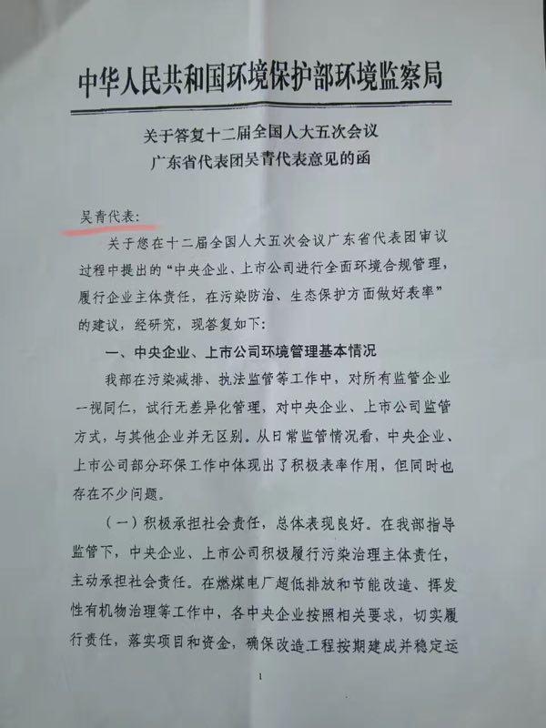 “环保部提出的加强对中央企业、上市公司环境监管的三点工作计划,措施得力,特别是提出每季度将严重超标企业名单移送证监会、人民银行等相关部门,在环保部网站和‘信用中国’网站向社会公布,这一点非常准。”3月16日晚,全国人大代表、北京市金杜(广州)律师事务所合伙人吴青对澎湃新闻表示,自己已收到了环保部环境监察局3月13日答复其意见的函件。