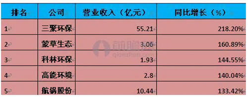 图表1:2017年一季度年中国环保上市企业营业收入增速TOP5(单位:亿元,%)
