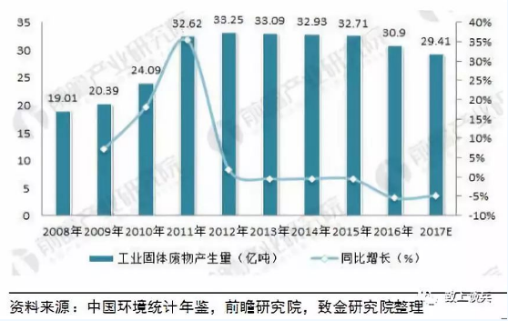 图表:2008-2017年中国工业固体废物产生量及增长情况