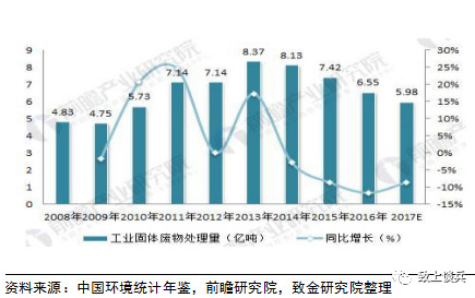 图表:2008-2017年中国工业固体废物处置量及增长情况