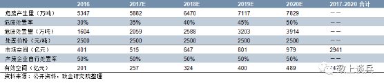 从环保产业市场来看,我国固废处理行业还处于发展初期,固废处理投资占环保行业整体投入比重不足15%。而在发达国家,固废处理是环保领域投资和产值占比均超过50%的最大子行业。结合我国固废行业发展状况来看,无论是存量需求还是增量需求,行业市场前景都较大。据环保部规划院测算,预计“十三五”期间社会环保总投资有望超过17万亿元。根据行业发展,未来几年固废市场规模将占环保投资总额的30%左右。据此测算的话,“十三五”期间固废处理行业投资区间在4.25-5.10万亿之间。
