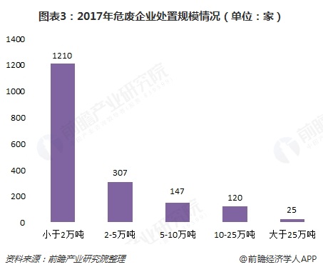 正因此,我国危废处理行业参与者较多,但企业规模普遍较小。根据2017年7月的数据统计,我国危废处理企业产能低于2万吨、2-5万吨、5-10万吨、10-25万吨和25万吨以上的企业数量分别为1210家、307家、147家、120家和25家,67%的企业危废处理产能低于2万吨。