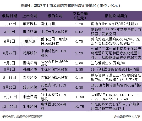 由于危废处理处臵行业市场毛利率高,现金流好,且在未来的几年间供需关系将持续紧张的大背景下,项目的盈利能力有进一步提升的空间,因此具备资金和项目管理优势的上市环保公司出于产业布局和财务投资的角度,在最近两年(特别是2017年后)通过并购的方式大举进入危废领域。
