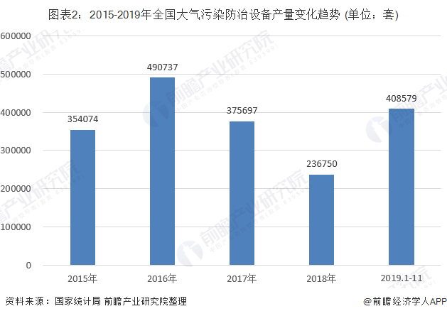 在节能环保政策趋严的背景下,我国大气污染行业得到发展,大气污染防治设备产量增长加快。根据数据统计,2018年我国大气污染防治设备产量为23.68亿台,同比下降了41.67%。2019年1-11月,全国大气污染防治设备产量达到40.86亿台,超过2018年全年。大气污染防治设产量回暖与国家节能环保政策趋严密切相关。
