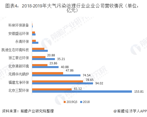 大气污染治理行业的周期性、区域性、季节性等特征使得行业内企业发展同样具有一定的波动性和区域性特征。2018-2019年,大气污染治理企业中,北京三聚环保、福建龙净环保和无锡华光锅炉三家企业营收远高于其他同行企业。2018年,北京三聚环保以153.81亿元的营业收入排名第一;福建龙净环保则以94.02亿元的营收屈居第二,无锡华光锅炉以74.54亿元位列第三。2019年前三季度,福建龙净环保以78.65亿元超过北京三聚环保位列第一,北京三聚环保以61.12亿元屈居第二。