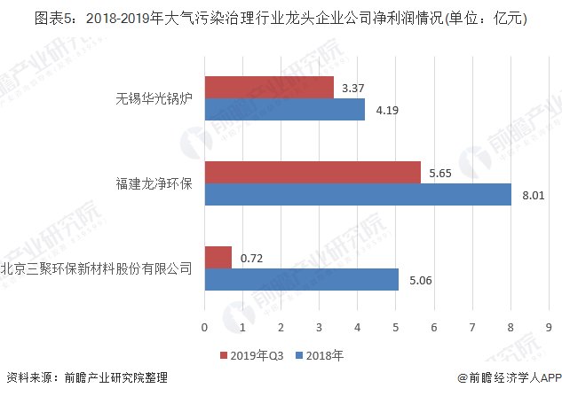 净利润方面,2018年,福建龙净环保以8.01亿元的净利润超过北京三聚环保位列第一位,北京三聚环保以5.06亿元净利润超过无锡华光锅炉4.19亿元的净利润位列第二位。2019年前三季度,福建龙净环保以5.65亿元的净利润排名第一位,北京三聚环保则以0.72亿元的净利润排名末位。