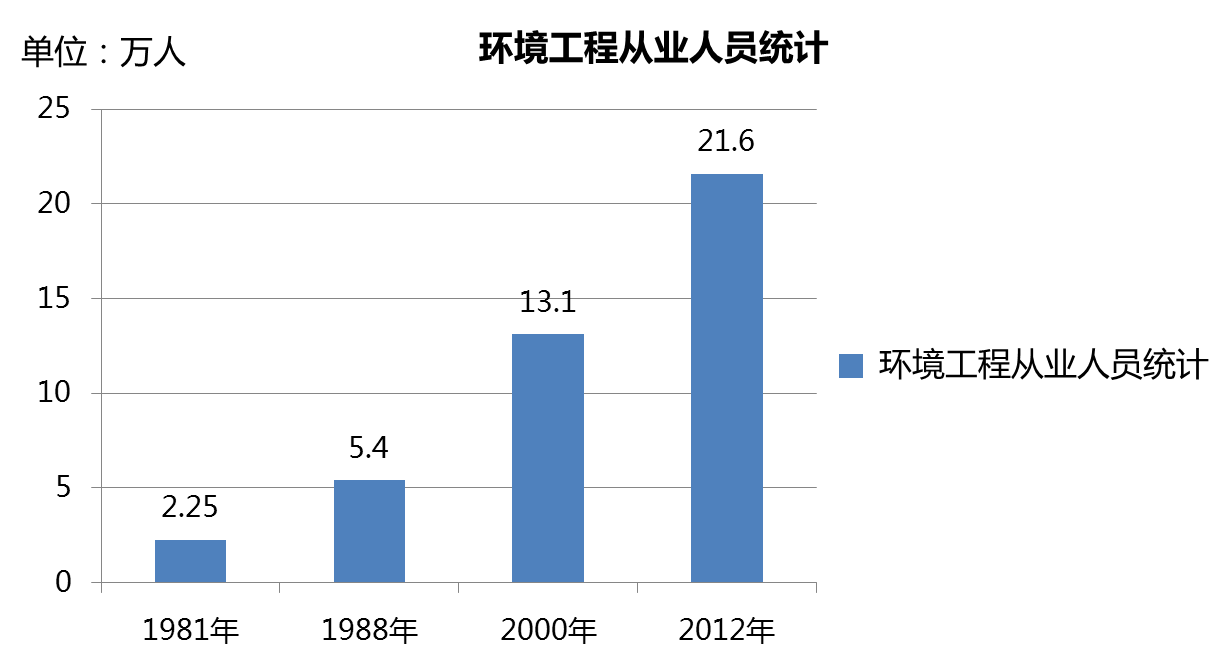 我国环保人才队伍的现状特征人才队伍规模不断壮大。近几十年,随着我国环境问题的凸显,我国环保人才迅速增加,环保从业人员从无到有,从少到多。如下图所示:1981年底只有2.25万人,1988年底为5.4万人,2000年底为13.1万人。随着环保机构和环保人才队伍的壮大,截至2012年底,我国环保系统人才资源总量为21.6万人;全国每万人口中的环保人才为1.6人,单位国土面积的环保人才为225人/万平方千米,其中环境监测人员为65.3人/万平方千米,环境执法人员为72.6人/万平方千米。