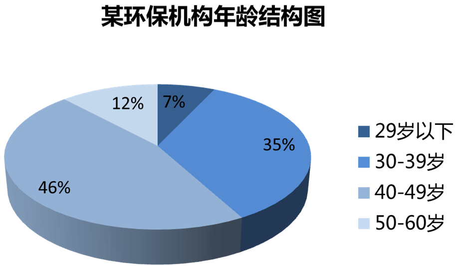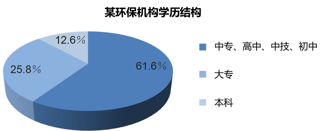 由下图可以看出,环境工程行业员工年龄、学历结构配置不合理,年轻人才告急,高素质人才告急,人才和谐发展告急。近年来,环保部门由于机构编制管理不断规范、干部新陈代谢不快等原因,几乎没有增编,很多单位因此不能选拔年轻干部,导致许多单位干部年龄结构老化、青黄不接,以下图为例,在159名职工中,29岁以下的11人,占7%,30~39岁的56人,占35%,40~49岁的73人,占46%,50~60岁的19人,占12%;其次岗位结构不合理。