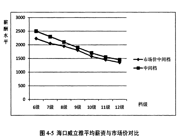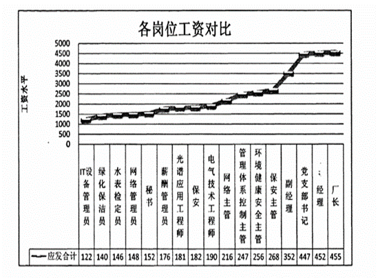 关键技术岗位薪酬低于行政管理岗位,也低于市场水平,部分工作价值一般的岗位却高于市场水平,致使关键岗位的人员流失,无法有效驱动工作效率低下的员工,也无法吸引综合素质和工作业绩优秀的员工,影响企业的生产效率。合资后企业进行了组织架构变革,重新定岗定编,部门职责和工作说明书也已出台,工作进行了细化和量化。下图为由经理到员工的实际工资水平趋势图,体现国企传统的薪酬特征,工资随职务而上升,坡度平缓,技术人员和一般行政管理人员在一个级别。