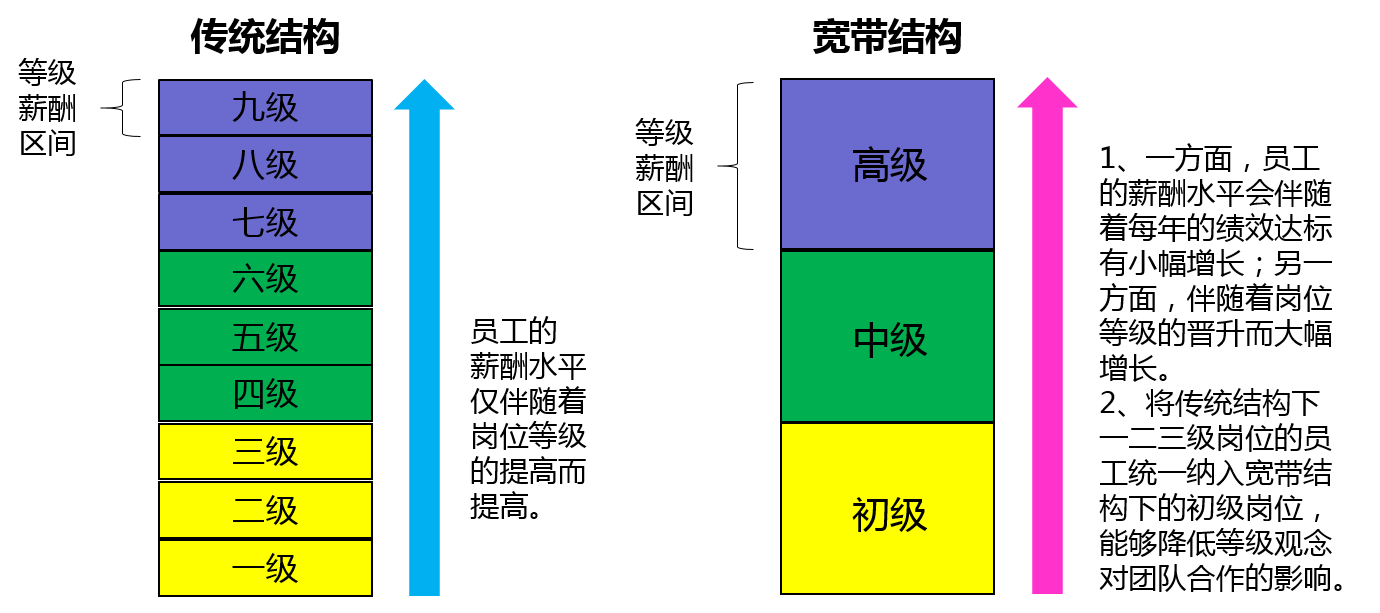 支持扁平型组织结构,打破了传统工资结构所维护和强化的那种严格的等级制,有利于企业提高效率以及创造参与型和学习型的企业文化,同时对于企业保持自身组织结构的灵活性以及迎接外部竞争都有着积极的意义。