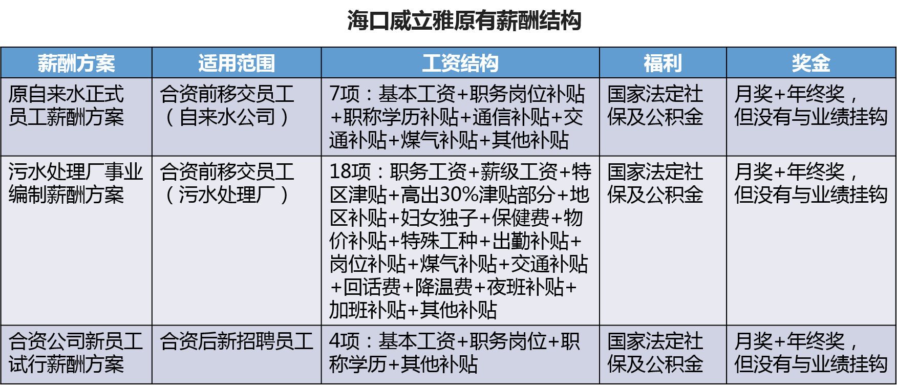 因历史原因,海口威立雅公司有四套薪酬方案,如下图所示包括:自来水正式员工薪酬方案、污水处理厂事业编制薪酬方案、合资公司新员工实行薪酬方案,还有一套为原有事业单位的编外人员的薪酬方案。不一样的薪酬制度造成员工内部调动时工资调整难度大,绩效考核标准和力度难把控。由于薪酬方案种类繁多,薪酬发放执行标准不一致。同一家公司同一个岗位,套用的工资制度却不相同。薪酬没有体现同工同酬的原则,员工也不清楚支付给自己的薪酬的各组成部分。下图为海口威立雅原有薪酬结构。