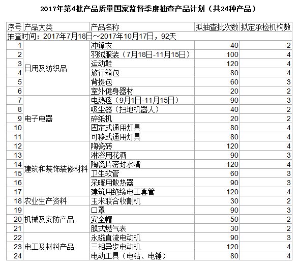 2017年第4批产品质量国家监督季度抽查产品计划共涉及24种产品,包括日用及纺织品、电子电器、建筑和装饰装修材料、农业生产资料、机械及安防产品、电工及材料产品六大类。抽查时间为2017年7月18日~2017年10月17日,共92天。