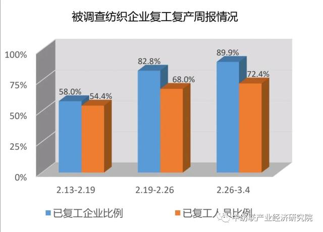 最近一周以来,纺织产业链中下游企业复工复产情况逐步改善,纺织服装专业市场复工开市进度有所加快,2月中下旬比较突出的产业链上下游复工不同步问题逐步得到缓解,产业链运转协同性正在逐渐恢复。