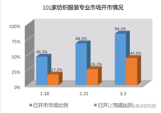 根据中纺联流通分会3月3日对全国101家重点纺织服装专业市场的调查数据,单体市场开市率已经达到84.2%,比前一周调查时提高15.9个百分点;已开市商铺数为3.7万个,占正常情况下市场商铺总数的比例为44.3%,虽然仍有大量商品未恢复营业,但这一比例较一周前已经提高了18.1个百分点。
