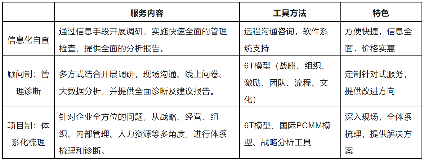 在为企业提供管理诊断时,华恒智信提供的信息化工具能够从更全面的角度、更符合企业自身情况地开展调研,独创的6T工具模型能够从多个角度对企业做出诊断,结合大数据库中来自于数百家各行各业的企业经验,对各类常见难题、疑难杂症均有丰富的研究。经过多年咨询实践,华恒智信人力资源公司通过大数据与专业工具方法结合,形成独特的信息化体系,可以解决管理诊断及管理提升等各方面的问题,有效支持企业提升管理水平。