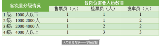 借用华恒智信计算工作量的工具模型,明确忙闲时间段,以及测算不同客流量人数时,各岗位需要的人数数量。当客流量达到一定程度时,企业可根据需要人数调配岗位人数、或根据岗位人数计算员工工作量。例如下图,某旅游景区的客流量达到了4000人以上时,需要三位检票员,然而仅有两位在岗,这时通过临时协调人员,或者给二位工作人员计入更多的工作量或调休时长来进行解决。