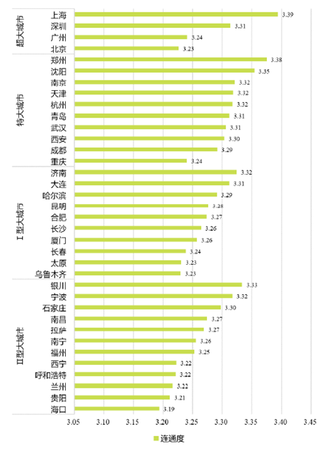 “连通度”反映道路网的通达性,是另一个检验道路网结构合理性的指标。连通度越高,道路网连通情况越好。根据《画像报告》,36个重点城市的道路网连通度介于3.2~3.4,与连通度合理值3.6~3.9相比,道路网连通程度整体偏低。