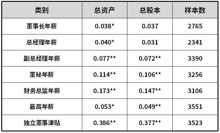 为分析公司高管年薪和公司规模的相关性,“荣正咨询”选取了董事长、总经理、副总经理、董秘和财务总监的年薪以及最高年薪、独立董事津贴进行分析,研究高管薪酬与总资产和总股本的相关性,分析结果如表2所示: