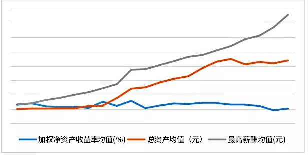 注:因总资产均值与最高薪酬均值差别过大,故最高薪酬均值同乘10万以便对比。