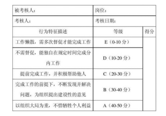 操作起来很简单:描述职务工作可能发生的各种典型行为,对行为的不同情况进行度量评分,在此基础上建立锚定评分表,作为员工绩效考评的依据,对员工的实际工作行为进行测评给分。