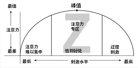 在曲线的两端,是处于缺乏刺激和过度刺激的状态,这时候的注意力水平都是很低的。在曲线的中部,受到的刺激程度恰到好处,而注意力则处于最佳状态。这就是你的注意力专区。