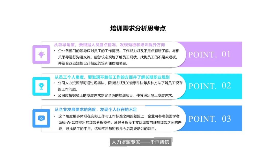华恒智信研究团队基于该过程出发,结合多年实践经验建议企业在开展培训需求分析工作时可从以下三方面思考: