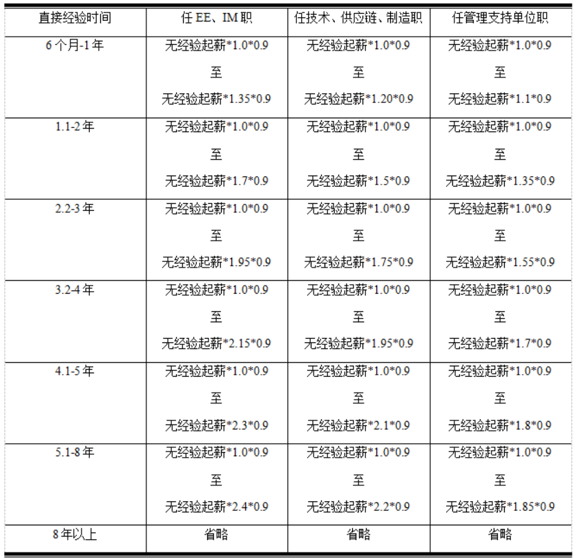 某企业对新进有经验人员的核薪参考标准: