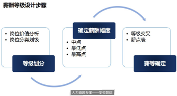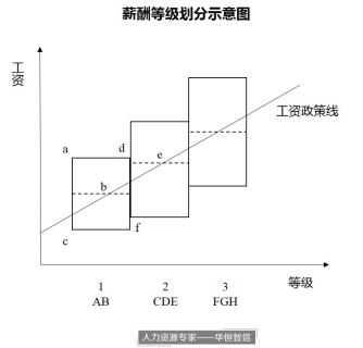 在薪酬等级划分阶段,需要判定哪些岗位是大致相同的,从而将它们归到一类薪酬等级中去,这就需要结合职位价值评估结果。设计者需要注意的是,每一个薪酬等级都有自己特定的薪酬宽度和幅度,彼此之间可能存在差异,在同一等级中的不同职位的薪酬幅度是相同的。