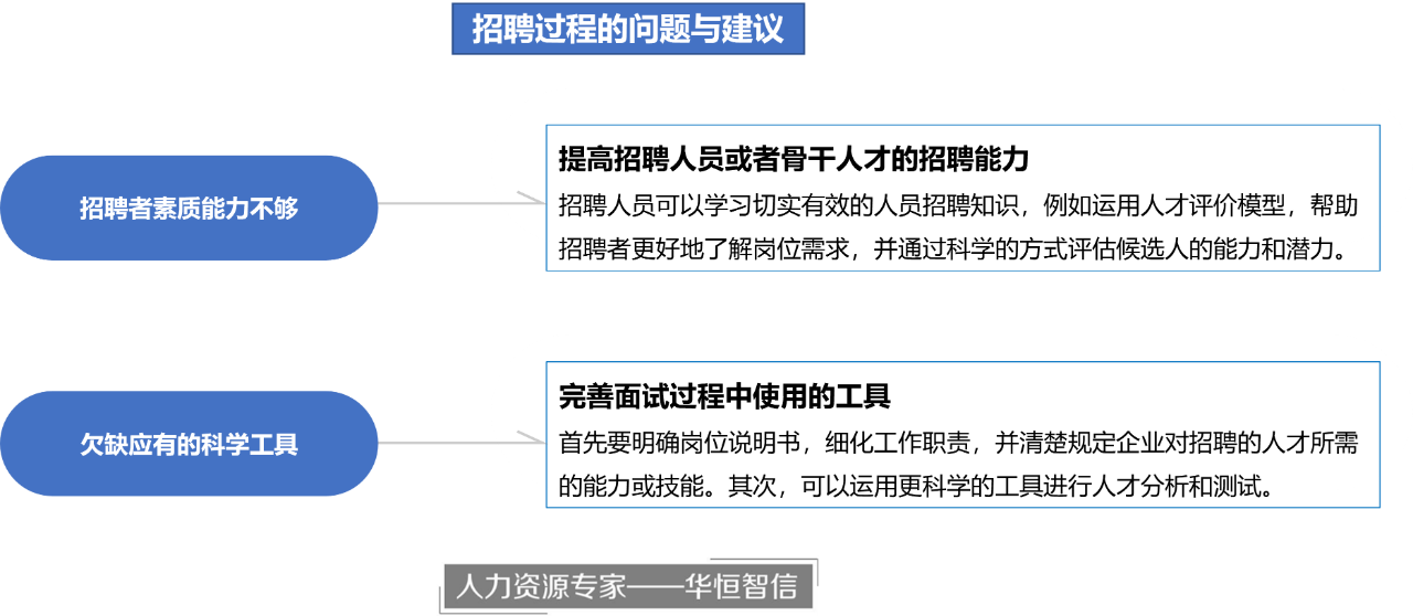 对于发展中的企业而言,招聘到合适的人才是很重要的,但部分企业在招聘中往往招不到合适的人才,导致人力资源的不足。华恒智信专家老师总结多家企业的经验,认为出现上述现象主要是由以下两方面原因造成的: