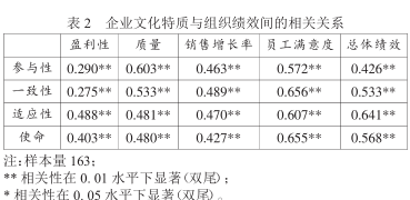 由表 2 可以看出,四个企业文化特质与所有选定的组织绩效变量存在相关关系。