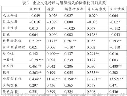 2. 回归分析。 本文将企业文化特质与组织绩效的标准化回归关系归纳为表 3 。