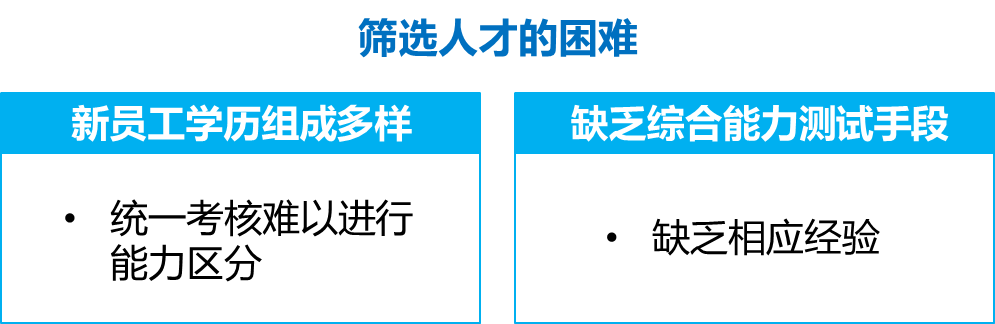 1、新员工学历组成多样,公司内部进行统一考核难以对新员工进行能力区分。招聘的40名员工中,有专科院校的本科生,有三类本科、二类本科、一类本科的学生,同时还有硕士研究生。不同学历等级的学员要进行统一的综合能力测试存在困难。
