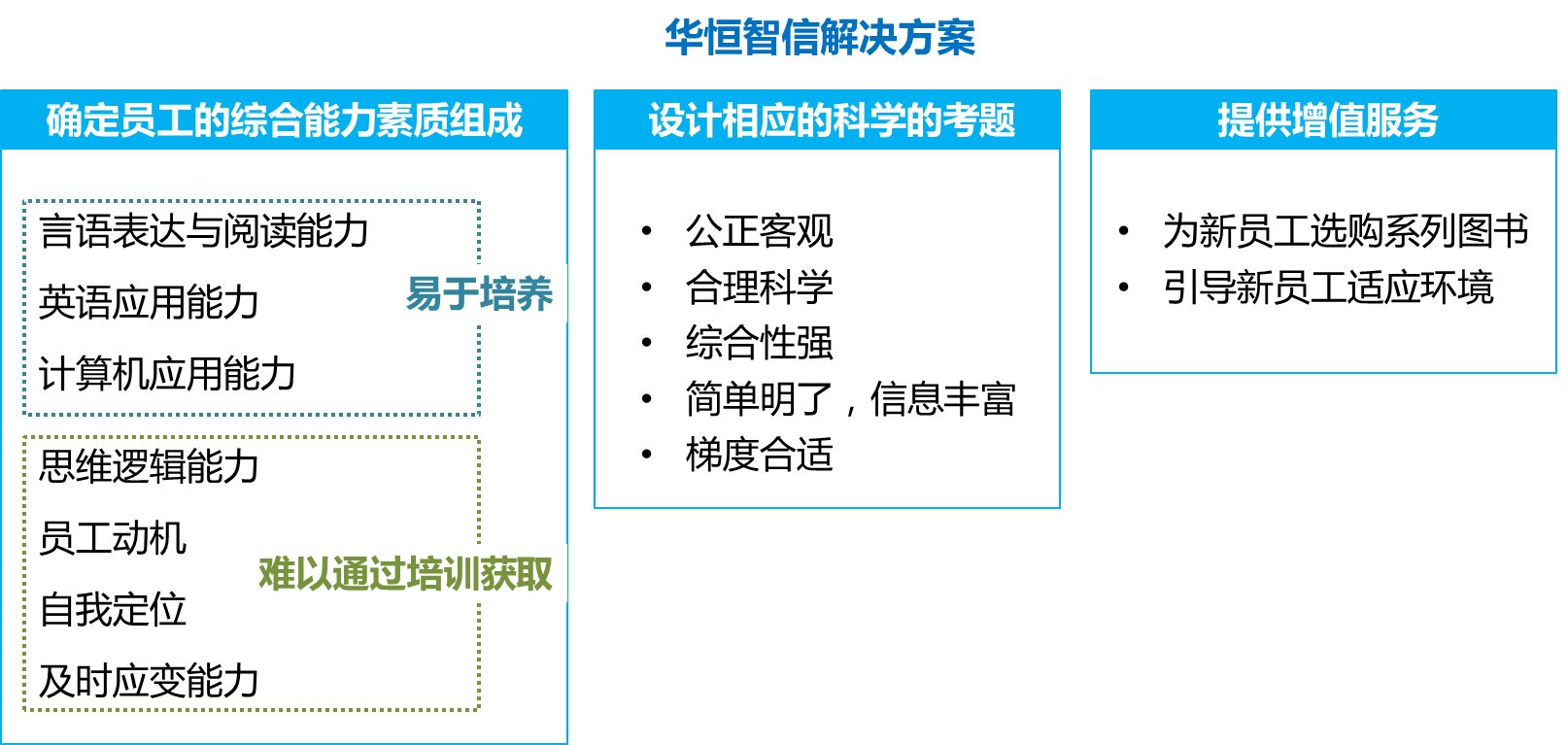 2、其次,在确定胜任素质后,华恒智信需要帮助企业设计具体可行的测评方案。确保该方案能够有效地将来自不同学历层级的新员工按照综合能力素质进行划分。