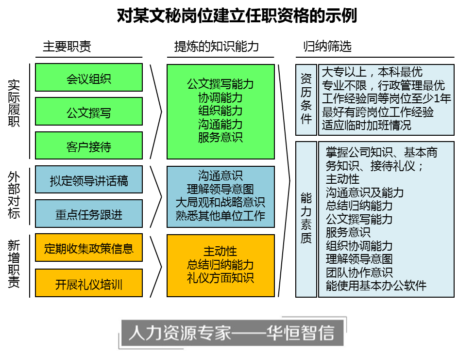 首先通过访谈调研,明确各部门实际开展的工作,明确整体的序列划分、层级划分等。通过分析每个序列下各岗位的实际工作内容,明确为了完成本岗位工作需要具备的工作能力。例如,对于行政部门的文秘人员,主要的职责在于会议组织、公文撰写、客户接待等。因此对该岗位需要的任职资格初步提炼为公文撰写能力、协调能力、组织能力、沟通能力、服务意识等;为了达到相关要求,建议具备大专以上学历、文科类专业,最好有活动组织的经历等。按照类似思路,通过对标外部同等岗位、分析优秀人才的工作能力、分析岗位说明书的要求等,从各个角度提炼知识与能力要求,形成较为全面的任职资格要求,之后进行汇总、合并、梳理、筛选等,建立规范的任职资格要求。具体的方法如图所示: