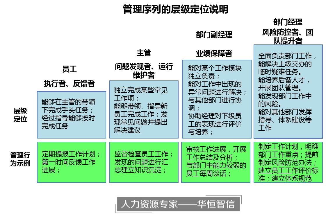 之后,项目组对各个层级明确工作定位,从调研中可以发现,目前各岗位的工作由于定位不清,往往出现领导层做的员工的事情、主管和员工做着一样的工作等现象。在任职资格建设过程中,项目组通过给每个层级清楚的定位,让大家明确应该做什么工作。例如,在技术方面,技术员的定位为:“在上级指导下开展工作,能协助上级完成某一模块的技术研发工作”,而工程师的定位为“能独立开展研发项目,能解决生产现场的常见问题,”高级工程师定位为“能带领团队完成重大课题、创新型研发项目,能解决现场的疑难问题,提出创新性解决方法”。在表述中,加入了能明确体现差别的表达。而在管理序列中,由于比起技术来说无法通过技术项目、业绩来体现层级差别,因此要加入工作经历、能力体现差别,更重要的是通过管理行为来体现。具体的方法如图所示: