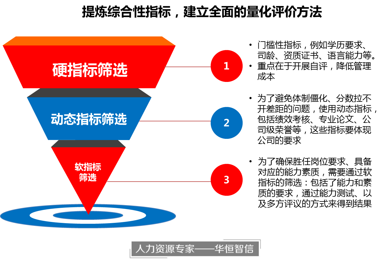 首先作为门槛性指标,选择硬指标开展筛选。例如一个员工要晋升,是否具备相应的学历要求、入职时间是否符合公司要求、是否有必备的资质证书、语言能力是否达到岗位要求等,这些条件是硬性的、客观存在的。