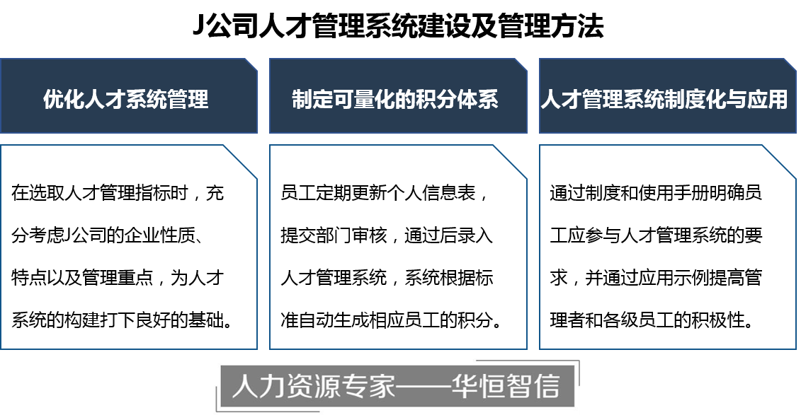因此,结合J公司现状,我们建议加强对人才数据的记录、分析工作,并以“积分”为抓手,可以对人才进行直观了解,并通过信息化系统的支持,进行全面地统筹和管理。