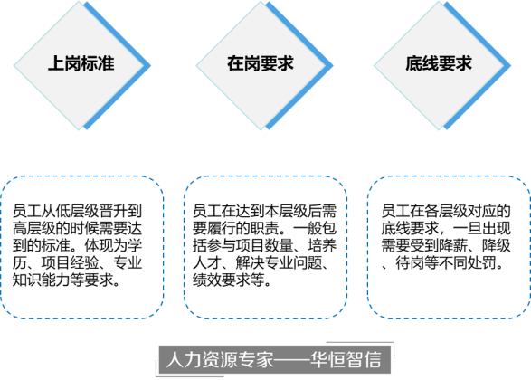 传统的任职资格标准建设中仅仅设置了一套标准,即晋升门槛标准,达到标准即可进入本层级。华恒智信公司在长期研究及实践中发现,仅仅设置上岗标准,容易出现很多后续问题,例如上岗后发现人员不胜任后如何解决、人员能力达到标准但是没有贡献对应的绩效如何解决等。因此项目组引入了多维度的任职资格评价标准,在人员进入本层级的时候要达到上岗标准,在上岗后要每年达到对应的工作要求、履行更高层级的职责。同时设置底线指标作为约束条件,在触犯底线指标后要受到相应的惩罚。