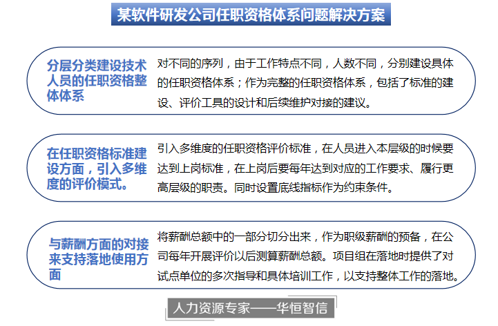 在公司数十年的发展过程中,重在向外开拓市场、对内建立技术实力,在管理方面相对重视不足,在技术人员的管理、激励方面相对粗放。在过去的发展过程中,凭借着运营和技术方面的优势,公司得以快速发展。近年来随着市场竞争逐步激烈,以及内部员工的更新换代,公司在管理方面的问题阻碍了进一步发展。这些问题体现在老员工躺在功劳簿上、新员工看不到发展前景、人才逐渐流失、员工积极性下降等各个方面。该公司经过内部调查,决定借助专业第三方的力量,针对技术团队开展管理改革,以任职资格为切入点进行管理精细化改善。经过多轮选择和竞标,该公司选择了常年从事人力资源咨询的专业公司华恒智信作为合作单位。