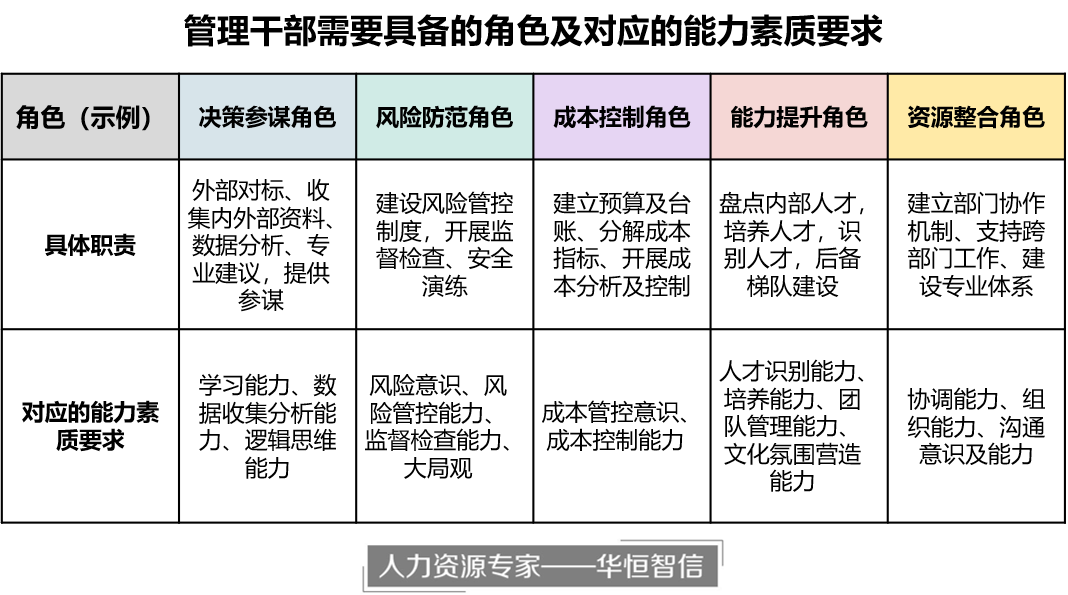 在实际调研中,项目组分析不同层级领导干部实际的工作职责内容,明确目前的实际角色,之后根据战略要求和公司发展,确定应该具备的角色定位。例如对于职能管理部门的经理,重在决策参谋、监督检查、风险防范、资源整合等角色,而对于生产厂区的厂长,则需要聚焦计划能力、组织能力、成本控制能力等。