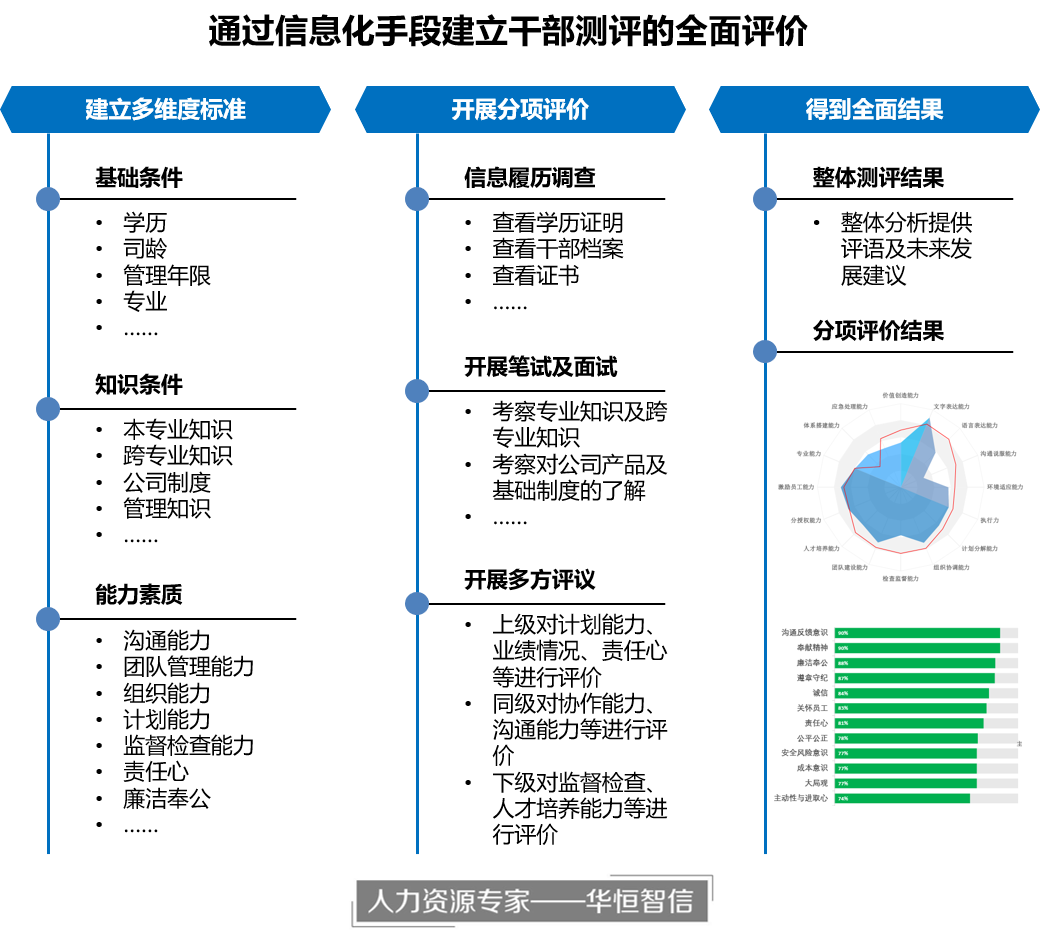 在得到全面的评价结果后,通过信息化方式进行处理分析,形成具体的、多维度评价结果。一方面可以为干部的晋升、选拔、调整、激励等奠定管理基础,另一方面,也为后续的能力提升、干部培养提供了方向。