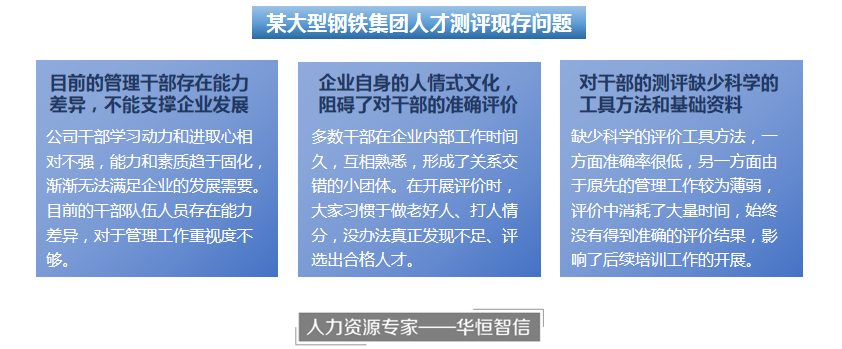 近年来,钢铁市场波动较大,为了保障业务稳定,公司从长远角度制定了强化管理、拓展业务的战略规划。在业务稳定的基础上,目前公司的短板在于管理方面,特别是在目前的管理干部能力、后备干部建设方面。公司经过多年发展,下设多个事业部、厂区、分公司,共有各级干部大约300多人,多数是跟随企业一同成长起来的,存在老龄化、思维固化等问题,很多干部从员工一步一步晋升上来,虽然执行力强但是管理能力不足。而公司近些年在干部队伍稳定的基础上,后备干部培养不到位,面临着无人可用的隐患。这些管理问题引起了高层的重视,经过几年的努力,该公司不断完善基础人力资源管理工作,并于数年前和华恒智信公司合作,建立了全面绩效考核体系,经过几年运行,支持了公司的工作目标完成和业务发展。但是,管理干部的能力不足限制了业绩提升、管理改善,公司希望通过对目前的管理队伍进行测评,发现不足,为下一步提升奠定基础。